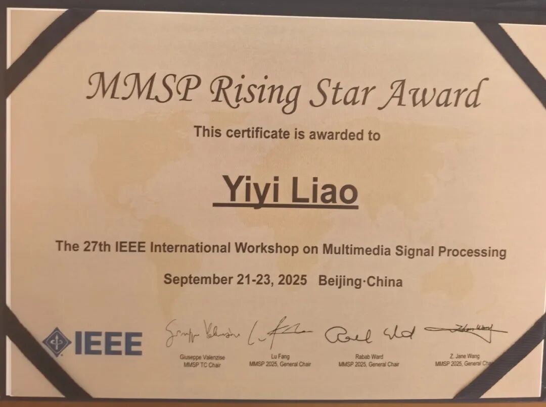9月22日,在由 IEEE 信号处理学会主办的第27届国际多媒体信号处理研讨会 (IEEE MMSP Workshop) 上,廖依伊研究员荣获多媒体信号处理新星奖( MMSP Rising Star Award )。